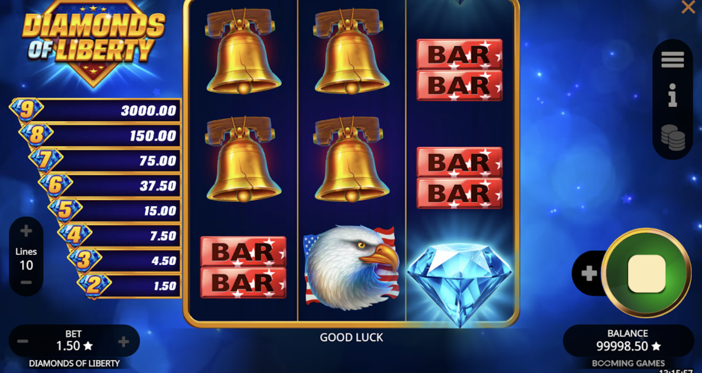 Descubre la nueva tragamonedas Diamonds of Liberty de Booming Games. Disfruta de un juego clásico de 3×3 con premios instantáneos de diamantes, giros gratis y un potencial de ganancia de hasta 2,000 veces tu apuesta.