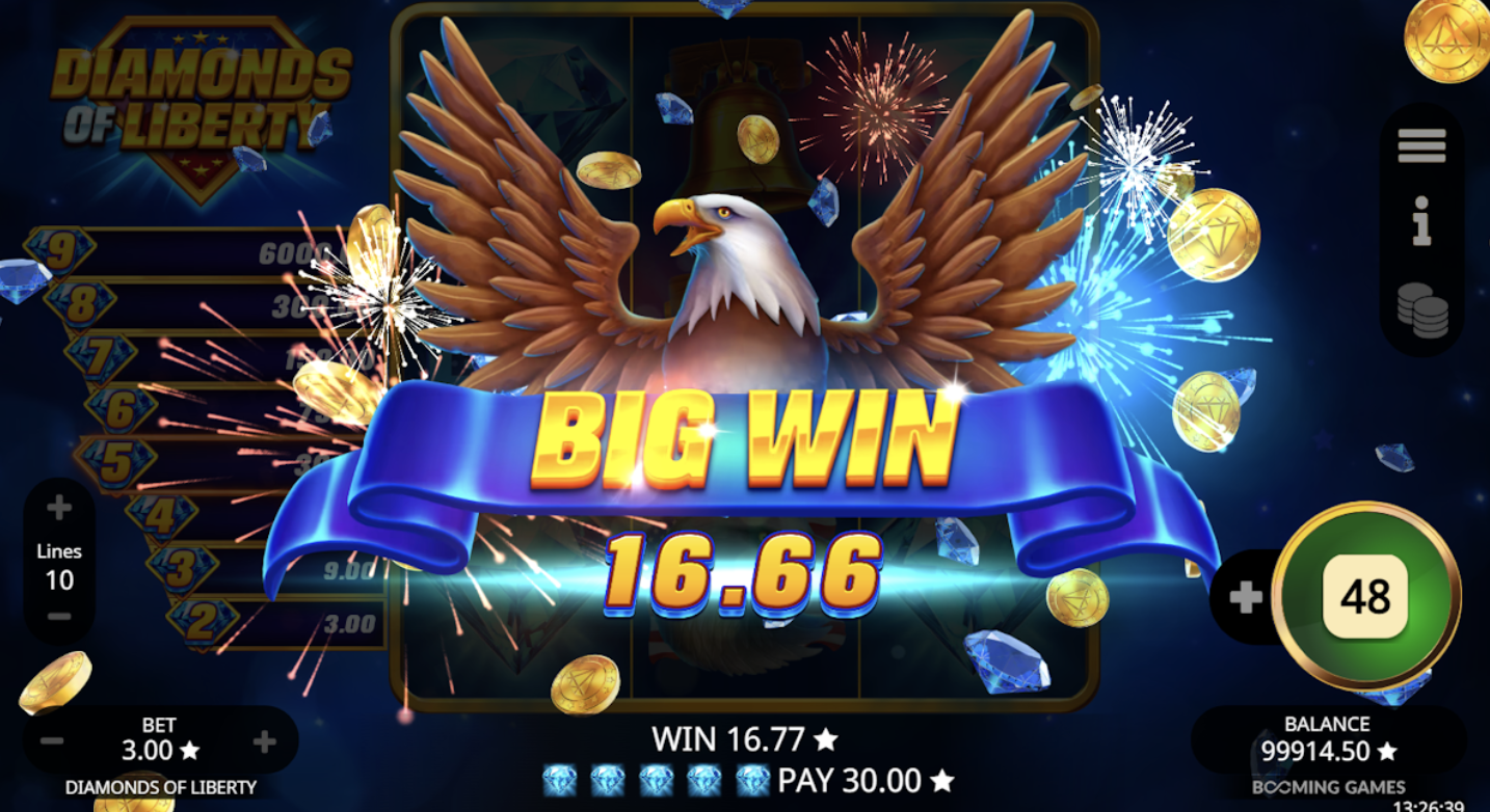 Booming Games ha lanzado Diamonds of Liberty, una nueva tragamonedas de 3×3 llena de íconos clásicos estadounidenses como águilas calvas, el sombrero del Tío Sam y la Campana de la Libertad. El tema patriótico aporta vibrantes estrellas, rayas y diamantes resplandecientes a cada giro.